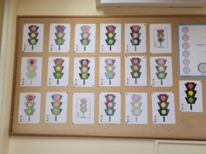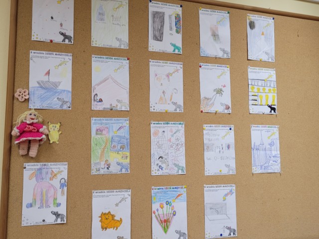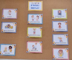 W świetlicy szkolnej dbamy o to, aby każdy czuł się bezpiecznie i miło spędzał czas. Na tablicy umieściliśmy zasady oraz prace plastyczne, które pomagają nam wspólnie tworzyć przyjazną atmosferę.