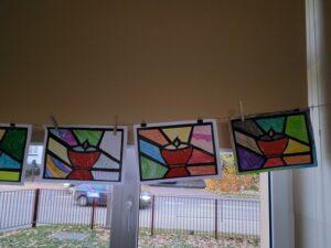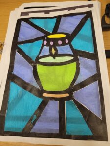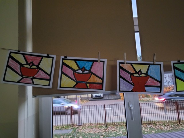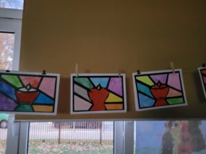 W świetlicy szkolnej dzieci wykonały piękne prace plastyczne – znicze witraże z okazji uroczystości Wszystkich Świętych. Podczas zajęć uczniowie z zaangażowaniem tworzyli kolorowe witraże przedstawiające znicze, będące symbolem pamięci o tych, którzy odeszli. Zajęcia stały się okazją do rozmowy o tradycjach związanych z tym świętem oraz do rozwijania kreatywności i wrażliwości plastycznej dzieci.