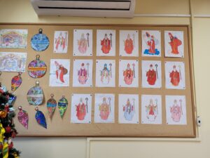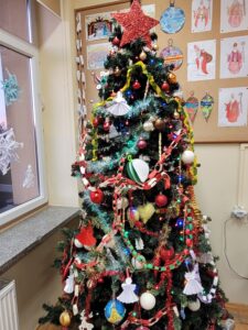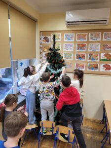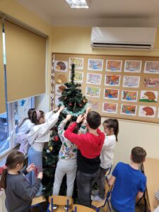 Do świetlicy zawitała Pani Zima, przynosząc zimową aurę i radosną atmosferę. Jednocześnie w obu świetlicach rozpoczęły się przygotowania do Świąt Bożego Narodzenia. W świetlicy dla klas I oraz w świetlicy dla klas II–III dzieci wspólnie ubierały choinki. Uczniowie z dużym zaangażowaniem wykonywali także prace plastyczne: gwiazdki, aniołki, stajenki, postacie Świętego Mikołaja oraz inne świąteczne dekoracje. Wspólne działania sprawiły, że w świetlicach zapanował ciepły, świąteczny nastrój.